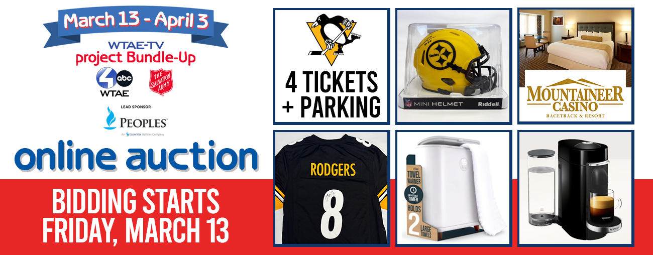 Get ready to bid, buy, and #bundlethemup in the WTAE-TV’s project Bundle-Up Online Auction! Three weeks to bid on 100+ DIFFERENT items each week through Greater Giving. The auction begins in March and ends April. More than 300 donated items ranging from overnight stays, experiences, restaurants, household items, sporting memorabilia, clothing, and much, MUCH more are displayed for your bidding pleasure. The bidding will begin MARCH 13!